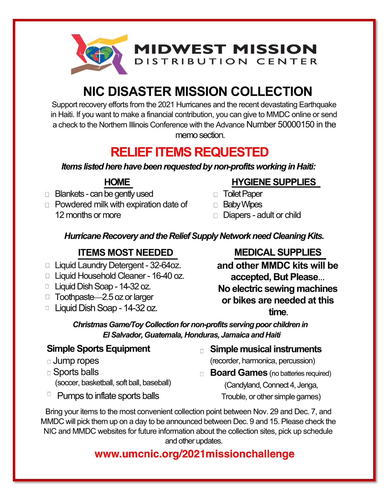 The NIC Board of Global Ministries with the Midwest Mission Distribution Center is organizing a fall collection drive from Nov. 29 – Dec. 7 to support recovery efforts from the 2021 Atlantic hurricane season and the devastating earthquake in Haiti. More details about the collection here.