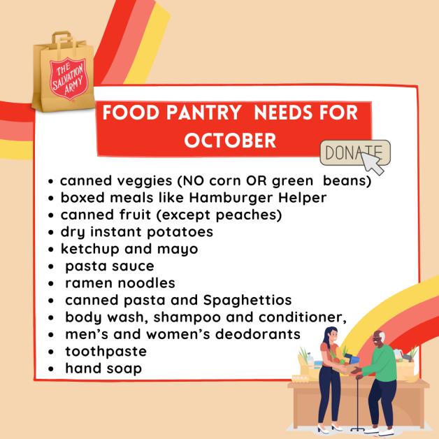 United Methodist Church supports the Salvation Army Food Pantry through donations each month. We also participate in the Angel Tree program at Christmas each year. Check back later in the year for more information on that program and how you can participate. Please leave items in Donation Station!